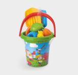 W zestawie 7 elementów: wiaderko, konewka, łopatka, grabki, 3 foremki.
