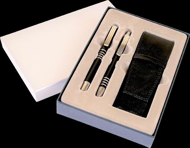 Długopis metalowy z metalowym wkładem typu parker o średnie grubosci pisania.Pióro metalowe z irydową grawerowaną stalówką grubości F Całość w wysuwanym pudełku wykonanym z twardego kartonu pokrytego grafitową tkaniną ,wewnątrz pudełka czarny flok Pudełko posiada przeźroczystą szybką