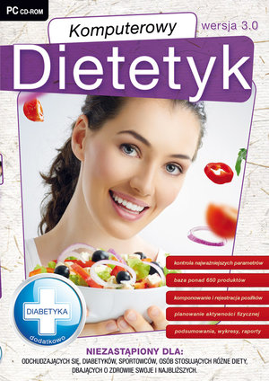 Komputerowy Dietetyk to program do komponowania, rejestracji i kontroli posiłków oraz ćwiczeń i aktywności fizycznej. Jest niezastąpionym narzędziem dla osób stosujących diety oparte na kontroli zawartości w posiłkach takich parametrów jak: kalorie, białka, tłuszcze, węglowodany, wymienniki węglowodanowe WW lub wymienniki białkowo-tłuszczowe WBT. Idealny dla osób odchudzających się, diabetyków, sportowców, osób stosujących diety lecznicze oparte na kontroli składników pożywienia. Dodatkowo wersja 3.0 została wzbogacona o rozbudowany moduł Diabetyki służący osobom z problemami prawidłowego poziomu cukru we krwi. Łatwa intuicyjna obsługa pozwala korzystać z programu osobom w każdym wieku. Program tworzy potrzebne podsumowania, raporty i wykresy. Pozwala planować menu żywieniowe. Najważniejsze cechy programu: · 2200 artykułów spożywczych w bazie · Możliwość dopisywania nowych artykułów · Uaktualnienia bazy artykułów · Sortowanie według wszystkich wielkości · Do 15 posiłków każdego dnia · Katalog posiłków ulubionych · Komponowanie i rejestracja posiłków · Rejestracja ćwiczeń i aktywności fizycznej · 140 zdefiniowanych ćwiczeń i aktywności · Możliwość dodawania nowych aktywności · Dowolna dzienna ilość wpisów aktywności · Podsumowania i wykresy kontrolowanych wielkości · Okresowe raporty posiłków i ćwiczeń · Wygodne opcje wizualizacji i wydruku · Szybkie zestawienia dzienne · Wygodny kalendarz dietetyka · Dowolna ilość użytkowników · Personalizacja ustawień · Archiwizacja danych · Ustawianie kolorystyki · Wbudowany system pomocy · Łatwa obsługa · Całkowicie po polsku Kontrolowane wielkości: · Kalorie · Białko · Tłuszcz · Węglowodany · Wymiennik węglowodanowy · Wymiennik białkowo-tłuszczowy · Poziom glukozy we krwi · Przyjęte dawki insuliny · Aktywność fizyczna · Bilans energetyczny Diabetyka: · Rejestracja poziomu cukru · Dobór i rejestracja dawek insuliny · Różne typy insulin i sposoby podania · Bolusy proste i przedłużone · Wykresy i podsumowania diabetyczne Kalkulatory: · BMI · Spalania kalorii · Zapotrzebowania energii PPM · Wagi idealnej według – Lorenza – Broca Wymagania sprzętowe: Komputer klasy PC z procesorem Pentium 1 GHz, system Windows XP/Vista/7/8. Całkowicie po polsku!