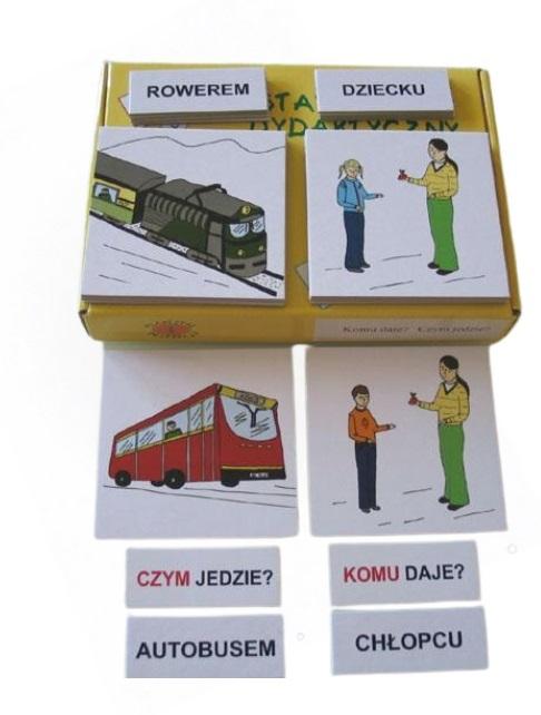 Zestaw plakietek i etykietek służy do przenoszenia obrazów z rzeczywistości na obrazki, uswiadamianiu dziecku, że słowo (napis) oznacza konkretną rzecz, czynność czy sytuację oraz do nauki czytania. Uczy dziecko rozumienia pytań oraz udzielania odpowiedzi.Zestaw ten składa się z dwóch oddzielnych zestawów ćwiczeniowych: Komu daje? i Czym jedzie?Zestaw (Komu daje?) służy do nauki zmiany końcówek rzeczownika w liczbie pojedynczej, która wymusza pytanie: Komu?, odpowiedzi na pytanie: Komu daje?Zestaw (Czym jedzie?) służy do nauki zmiany końcówek rzeczownika w liczbie pojedynczej, którą wymusza pytanie: Czym?, nauki odpowiedzi na to pytanie, oraz do nauki czytania zdań dwuwyrazowych: Jedzie.......(Czym?)
