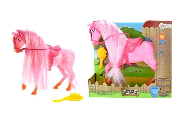 Figurka konia w kolorze różowym w zestawie ze szczoteczką, dzięki której można właściwie pielęgnować jego grzywę. Konik wyposażony jest również w siodło i kantar w kolorze różowym. Zestaw jest umieszczony w ładnym kartoniku-stajni co dodatkowo poszerza możliwości zabawy. Całość zestawu wygląda bardzo estetycznie. Konik stoi samodzielnie. Jego nogi nie są ruchome.