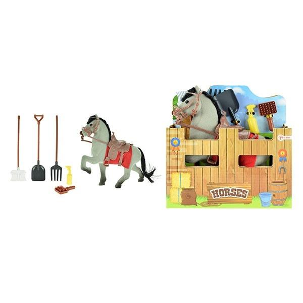 Toi-Toys Flokowany koń to zestaw figurki konia w kolorze szarym. Zabawka umieszczona jest w kartonowej zagrodzie koloru brązowego, w zestawie z typowym dla niej wyposażeniem w postaci : szufli, wideł, szczotki, miotły i spryskiwacza, które pomogą w jej utrzymaniu. Zabawka wyposażona jest w brązowy kantar, siodło i czerwony kocyk pod siodłem. Konik stoi samodzielnie, a jego postawa wskazuje na galop.