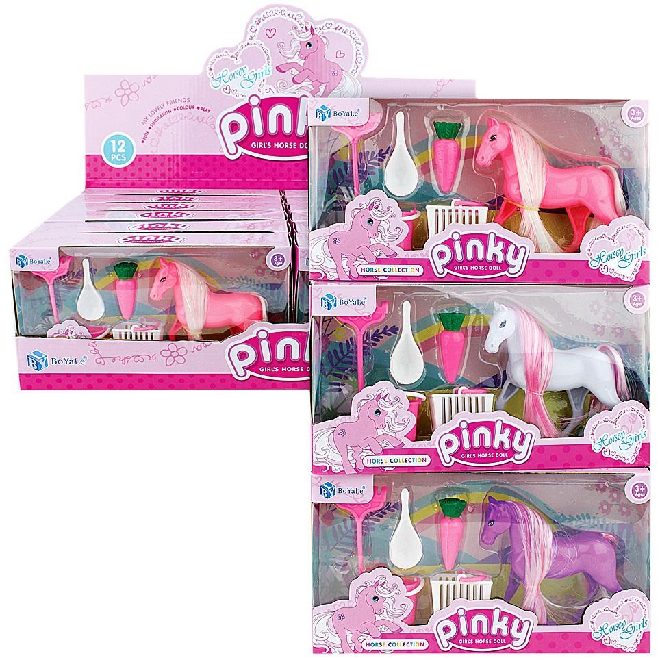 Konik z grzywą i ogonem do czesania. W zestawie akcesoria: szczotka, marchewka, grabie, paśnik, wiadro.