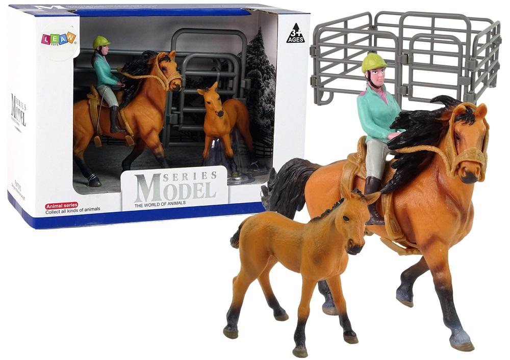 Zestaw 3 figurek Koń ze źrebakiem w zagrodzie + Jeździec i Zdejmowane Siodło Wspaniale wykonane z najwyższą dbałością o szczegóły figurki koni, powiększą kolekcję każdego małego kolekcjonera. Rozmiary modeli są idealnie dostosowane do małych rączek, więc przy okazji poćwiczy chwyt i precyzję. Każda figurka została starannie odlana z tworzywa i pomalowana, przez co wiernie oddaje rzeczywisty wygląd zwierzęcia. Figurki pozwolą każdemu dziecku na stworzenie własnego gospodarstwa w swoim pokoju oraz stworzenie różnych scenariuszy zabaw. Konie są urocze i zachwycą każde dziecko. Duży Koń wyposażony jest w zdejmowane siodło. Elementy zestawu: - Dorosły koń ze zdejmowanym siodłem - Źrebak - Elementy zagrody z otwieranym wejściem - Jeździec Wysokość figurek: - Dorosły koń: 13 cm x 11 cm x 4 cm - Źrebak: około 11 cm x 9 cm x 3 cm - Jeździec 8 cm x 3 cm x 5 cm Wymiary pudełka: 22 cm x 14 cm x 10 cm Zabawki przeznaczone są dla dzieci powyżej 3. roku życia. Figurki posiadają certyfikat CE i są zgodne z normą EN 71. Zapakowane jest w kartonik, dzięki czemu nadaje się idealnie na prezent.