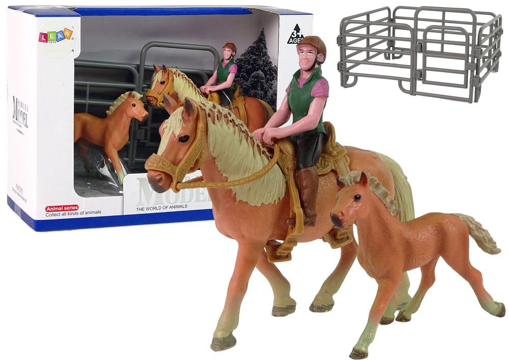 Zestaw 3 Figurek z zagrodą Jazda Konna Wspaniale wykonane z najwyższą dbałością o szczegóły figurki koni, powiększą kolekcję każdego małego kolekcjonera. Rozmiary modeli są idealnie dostosowane do małych rączek, więc przy okazji poćwiczy chwyt i precyzję. Każda figurka została starannie odlana z tworzywa i pomalowana, przez co wiernie oddaje rzeczywisty wygląd zwierzęcia. Dorosły koń posiada zdejmowane siodło. Figurki pozwolą każdemu dziecku na stworzenie własnej stadniny koni w swoim pokoju oraz stworzenie różnych scenariuszy zabaw. Konie są urocze i zachwycą dziecko. Elementy zestawu: - Dorosły koń ze zdejmowanym siodłem - Źrebak - Jeździec - 4 elementowa zagroda dla koni z otwieranym wejściem Wysokość figurek: - dorosły koń: 13 cm x 10 cm x 4 cm - źrebak: około 10 cm x 9 cm x 3 cm - jeździec 8cm x 4 cm x 2 cm Wymiary pudełka: 23 cm x 16 cm x 10 cm Zabawki przeznaczone są dla dzieci powyżej 3. roku życia. Figurki posiadają certyfikat CE i są zgodne z normą EN 71. Zapakowane jest w kartonik, dzięki czemu nadaje się idealnie na prezent.