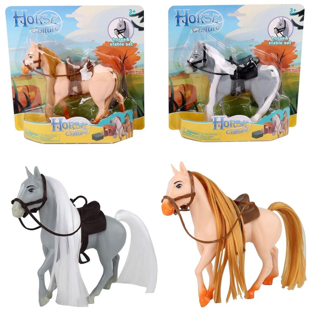 Koń z grzywą i ogonem do czesania, w zestawie z siodłem i ogłowiem.