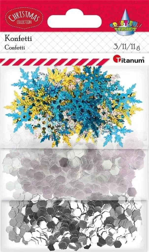 Konfetti mix 3 wzorów gwiazdki 35 mm złote, srebrne 3 g + okrągłe 7 mm miedziane, srebrne 11 g + sześciokąty 6 mm złote 11 g.