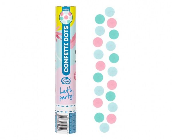 "KONFETTI KÓŁECZKA LET'S PARTY, 30 cm - 1 szt. Kolor: pastelowe (niebieski/różowy) Wzór: kółeczka Ilość sztuk: 1 tuba strzelająca Długość tuby: 30 cm Producent: Godan S.A."