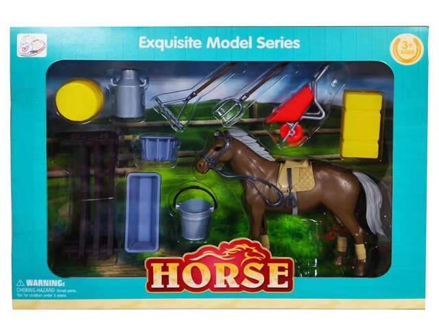 Konik, dodatkowe akcesoria: siano, miska do picia, grabie, widły, taczka, wiadro, przeszkody do skakania. Produkt nie potrzebuje baterii. Zabawka przeznaczona dla dzieci powyżej 3 roku życia.