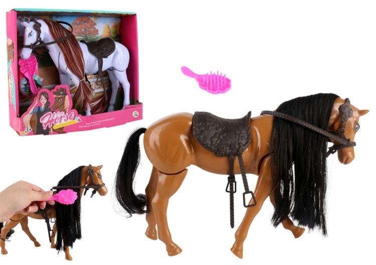 Koń został wyposażony w solidne siodło oraz uzdę, które pozwalają na pełne przygotowanie go do przejażdżek. Dodatkowo, zestaw zawiera szczotkę do pielęgnacji grzywy, dzięki czemu możesz czesać i stylizować jego długie włosy według własnych pomysłów. Gładka powierzchnia figurki i starannie dobrane materiały sprawiają, że zabawka jest przyjemna w dotyku i trwała.