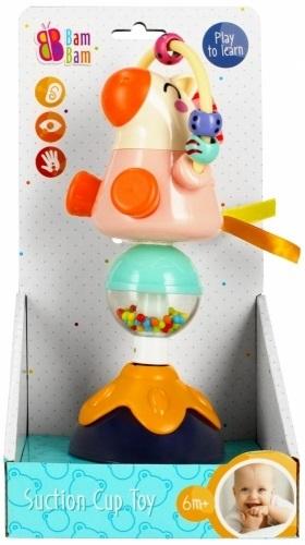KONIK na PRZYSSAWKĘ Bam Bam to zabawka edukacyjna przeznaczona dla maluchów od 6 m-ca. Postać uroczego konika osadzona jest na obracającej się, dwukolorowej platformie. W wyniku obrotu platforma wydaje delikatne, turkocząco- grzechoczące dźwięki, w tym dzięki kolorowym kuleczkom umieszonym w kuli, na której stoi konik. Nad zabawną postacią zwierzątka umieszczona jest obręcz z kolorowymi kuleczkami, których obracanie i przeciąganie z jednego końca na drugi doskonale ćwiczy zdolności manualne dziecka. Subtelna i zróżnicowana kolorystyka absorbuje uwagę dziecka aktywizując jego zmysły wzroku, dotyku, słuchu. Przyssawka osadzona pod zabawką zapewnia stabilne mocowanie do blatu stolika, tacki wózka czy krzeska do karmienia. Wymiary/waga/baterie: wymiary produktu (szer. x wys.)[cm]: 7x21, wymiary opakowania (dł. x wys. x gł.)[cm]: 14x26x12, waga produktu bez opakowania [kg]: 0,16 kg, waga produktu w opakowaniu [kg]: 0,23 kg, nie wymaga zasilania bateriami. Zabawka przeznaczona dla dzieci w wieku: 6m+. Pakowana w otwarty kartonik.