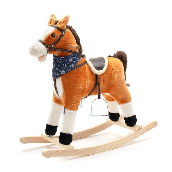 Przepiękny konik na biegunach został zaprojektowany z myślą o dzieciach lubiących przygody. Wygodne siodło, kantar, strzemiona, drewniane rączki i płozy zapewnią komfort i bezpieczeństwo podczas beztroskiego bujania maluszka. Konik przyozdobiony jest w przepiękną chustę. Przy naciśnięciu uszek rozlegnie się odgłos galopującego konika, konik macha ogonem, rusza pyskiem czy też zaśpiewa piosenkę. Maluszek bawiąc się musi skoordynować ruchy z konikiem co stymuluje jego koordynację ruchową i rozwija wyobraźnię oraz poprawia poczucie równowagi. Kieszeń z bateriami ukryta jest pod brzuszkiem konika. Baterie nie są dokładane. Charakterystyka: - drewniane rączki i płozy - strzemiona - stabilna konstrukcja - wyprofilowane siodło - kantar - interaktywne uszy - od 12 miesięcy - do 25 kg - mięciutki materiał - deklaracja zgodności CE - konik wymaga trzech baterii 1,5V AA Wymiary produktu: Wysokość 68 cm Długość płóz 78cm Długość konika 55cm Szerokość 30 cm Wysokość do siedziska 46 cm Szerokość siodła: 19 cm