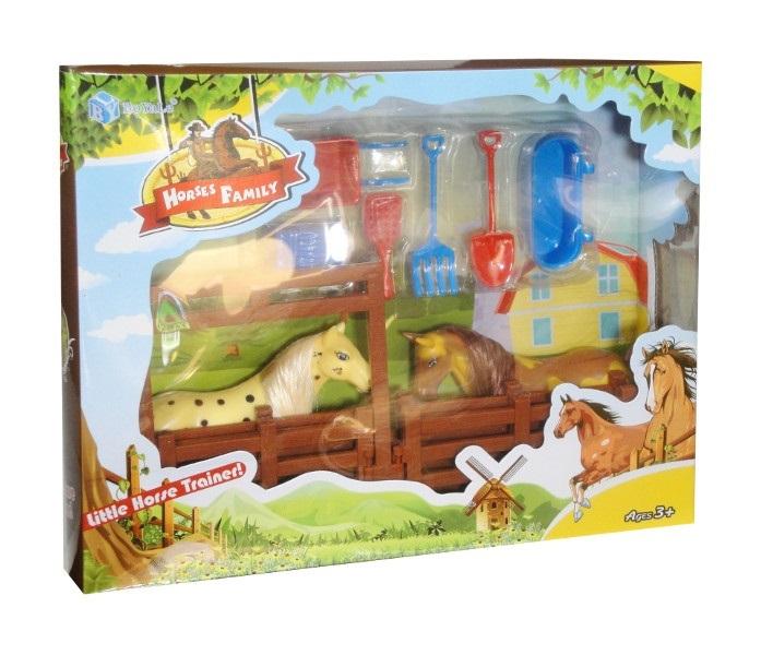 2 figurki koników w zagrodzie wraz z akcesoriami. M.in.: poidło, siano, taczka, szczotka, łopata. Produkt przeznaczony dla dzieci od 3 lat. Podane wymiary są wymiarami opakowania. Zabawka zapakowana w kartonowe opakowanie z przezroczystym okienkiem.