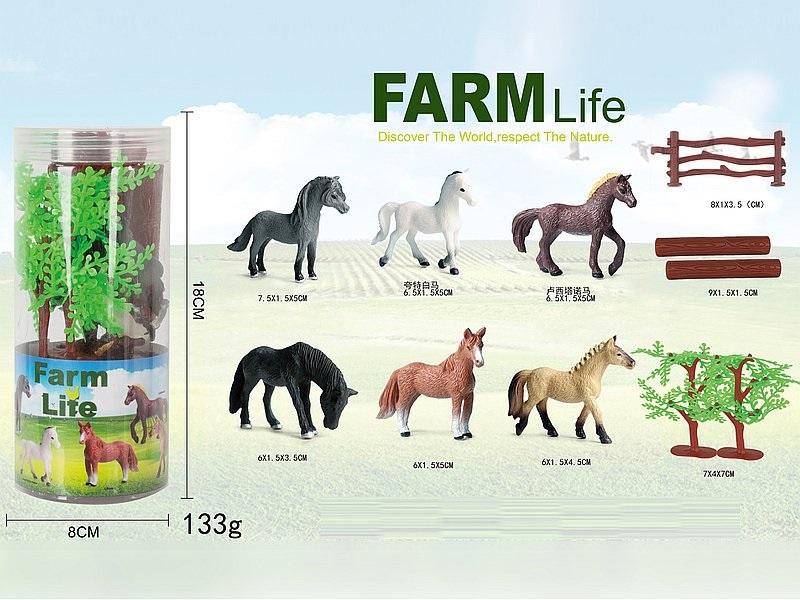 zestaw 6 koni w tubie, drzewka, zagroda; 18x8x8cm, PVC