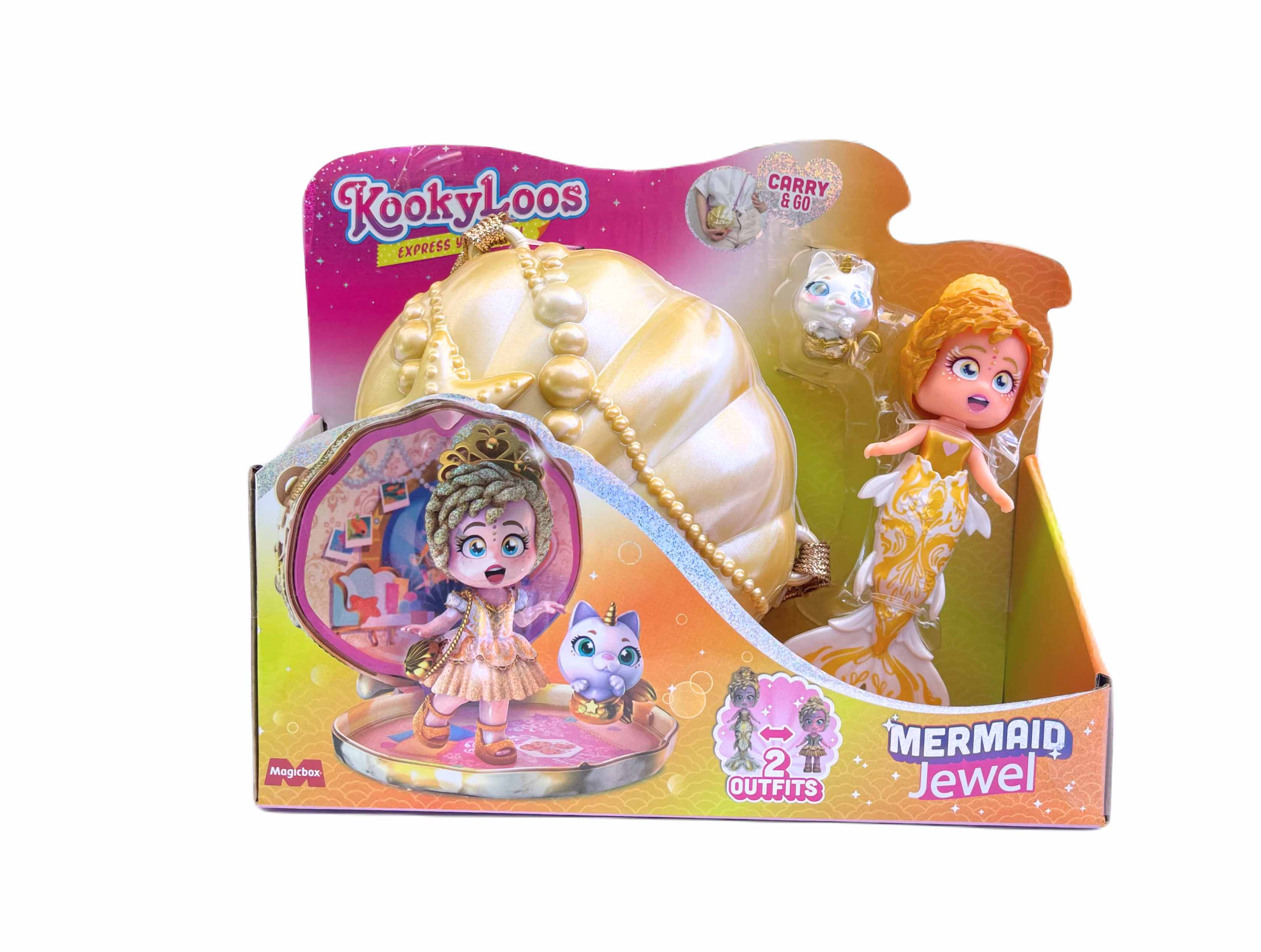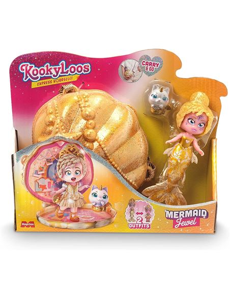 Każda z syrenek KookyLoos ma własną muszlę, która jest zarówno sceną do zabawy, jak i małą torebką, którą możesz zawsze mieć przy sobie! W środku muszli czeka mnóstwo akcesoriów i unikalny pupil-zwierzątko. Dodatkowo do każdej laleczki dołączony jest syreni ogon, który możesz w każdej chwili zdjąć, by odsłonić nogi KookyLoos i przebrać ją w ultramodny strój!