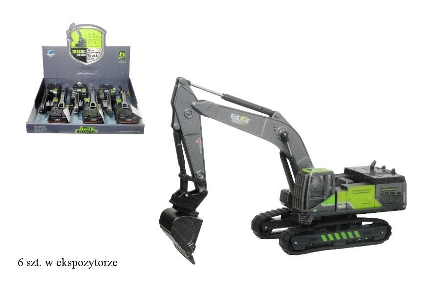 Koparka budowlana z ruchomymi elementami. Można ją podnieść do góry i wysunąć natomiast kabinę można obracać o 360 stopni. Pojazd posiada metalowe elementy. Będzie urozmaiceniem zabawy w plac budowy. Podane wymiary są przykładowymi wymiarami zabawki.