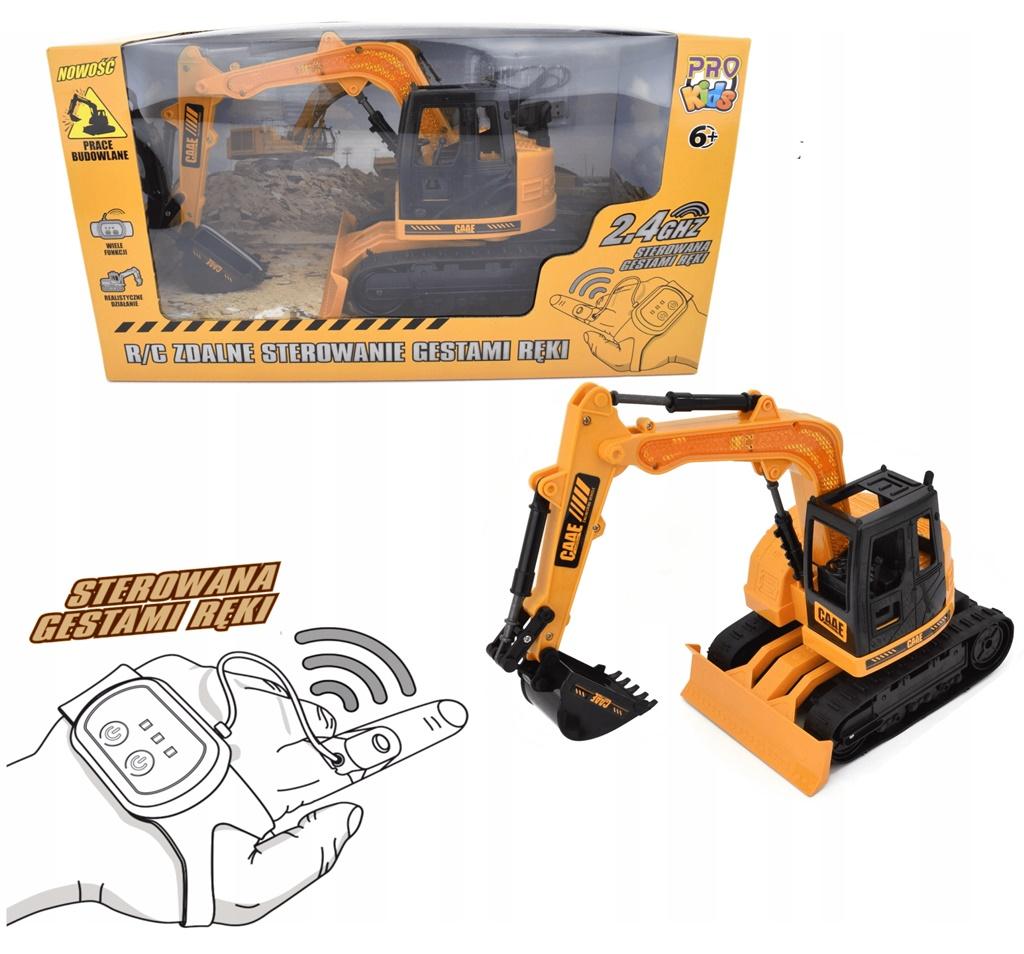 Koparka zdalnie sterowna za pomocą gestów ręki. Dzięki specjalnej opasce zakładanej na dłoń zabawka czyta nasze ruchy ręką i odwzorowuje je na zabawce. Super Zabawa i prosta kontrola nad pojazdem zapewni długie godziny zabawy. W kontrolerze dołączono przycisk zmiany funkcji nakładany na palec. Aby uruchomić pojazd należy raz nacisnąć przycisk startu z wyciągniętą ręką. Zabawka automatycznie połączy się z kontrolerem. Sterujemy ruchami nadgarstka poruszając do przodu, tyły, boki jak i również obracając nadgarstek w prawo i lewo. Po naciśnięciu przycisku na palcu zabawka zmieni funkcje ruchu z jazy pojazdem na wykonywanie specjalnych czynności. Koparka zacznie poruszać ramieniem i obracać wieżyczkę. Aby ponownie przemieścić pojazd należy przycinać przycisk funkcji. Aby wyłączyć zabawkę zależy przytrzymać główny przycisk zasilania na czujniku.Pojazd budowlany sterowany gestami. Częstotliwość 2,4 GHz. Sterowanie ośmiokanałowe koparka, sześciokanałowe wywrotka. W zestawie pojazd. Zabawka zasilana na baterie 4 x AA. Kontroler zasilany na akumulator.