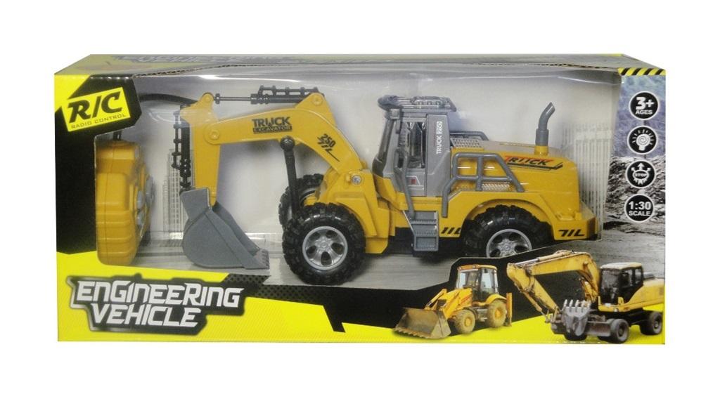 Plastikowa koparka budowlana sterowana pilotem. Pojazd porusza się do przodu, do tyłu, skręca w prawo i w lewo. Pojazd świeci także kolorowym światełkiem. Produkt działa na baterie typu AA. Baterie nie są załączone do zabawki. Zabawka przeznaczona dla dzieci od 3 lat. Produkt zapakowany w kartonowe opakowanie z przezroczystym okienkiem. Podane wymiary są wymiarami opakowania.