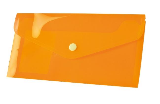 Koperta PP na zatrzask, mieszcząca format DL. Wymiary koperty: 220x110 mm,grubość: 0,14 mm. Pomarańczowa. Opakowanie: folia 12 sztuk.