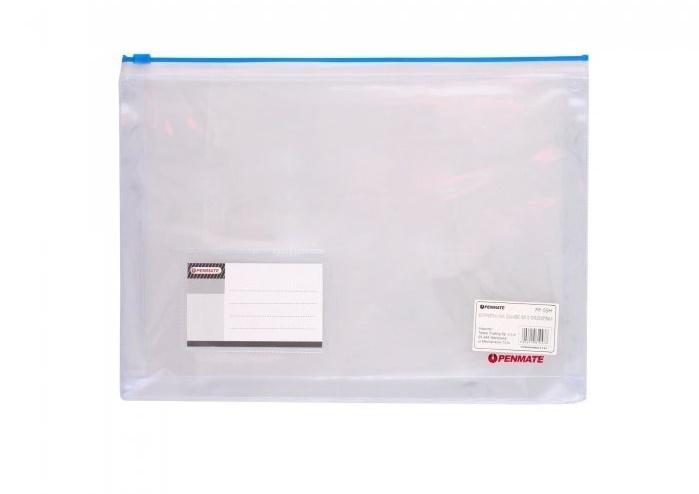 Koperta wykonana z wysoko przezroczystego PVC odpornego na rozdarcia. Zamykana na zamek strunowy w kolorze niebieskim. Regulowana grubość grzbietu do 30 mm, kieszeń na wizytówkę. Wymiary: 305 x 225 x 30 mm.