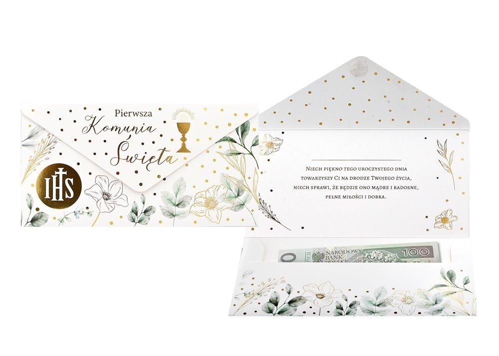 Koperta podarunkowa na I Komunię Świętą KOP-011. Koperta podarunkowa jest eleganckim sposobem na podarowanie bliskiej osobie banknotu lub karty podarunkowej. Koperta jest kolorowa i uszlachetniona metalizowaną folią hot-stamp, jest solidnie wykonana i wyposażona w rzep, co umożliwia jej wielokrotne otwieranie i zamykanie. Koperta zawiera życzenia w środku. Specyfikacja: wymiary: 20 x 10,5 cm (po złożeniu) wnętrze: życzenia w środku okazja: Komunia