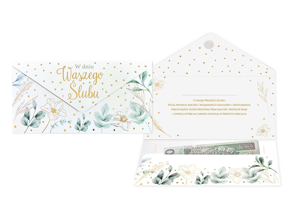 Koperta podarunkowa na Ślub KOP-025 Koperta podarunkowa jest eleganckim sposobem na podarowanie bliskiej osobie banknotu lub karty podarunkowej. Koperta jest kolorowa i uszlachetniona metalizowaną folią hot-stamp, jest solidnie wykonana i wyposażona w rzep, co umożliwia jej wielokrotne otwieranie i zamykanie. Koperta zawiera życzenia w środku. Specyfikacja: wymiary: 20 x 10,5 cm (po złożeniu) wnętrze: życzenia w środku okazja: Ślub