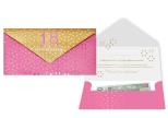 Koperta podarunkowa KOP-024 "18 urodziny" Koperta podarunkowa jest eleganckim sposobem na podarowanie bliskiej osobie banknotu lub karty podarunkowej. Koperta jest kolorowa i uszlachetniona metalizowaną folią hot-stamp, jest solidnie wykonana i wyposażona w rzep, co umożliwia jej wielokrotne otwieranie i zamykanie. Koperta zawiera życzenia w środku. Specyfikacja: wymiary: 20 x 10,5 cm (po złożeniu) wnętrze: życzenia w środku okazja: osiemnastka, urodziny Koperty są pakowane po 3 szt.