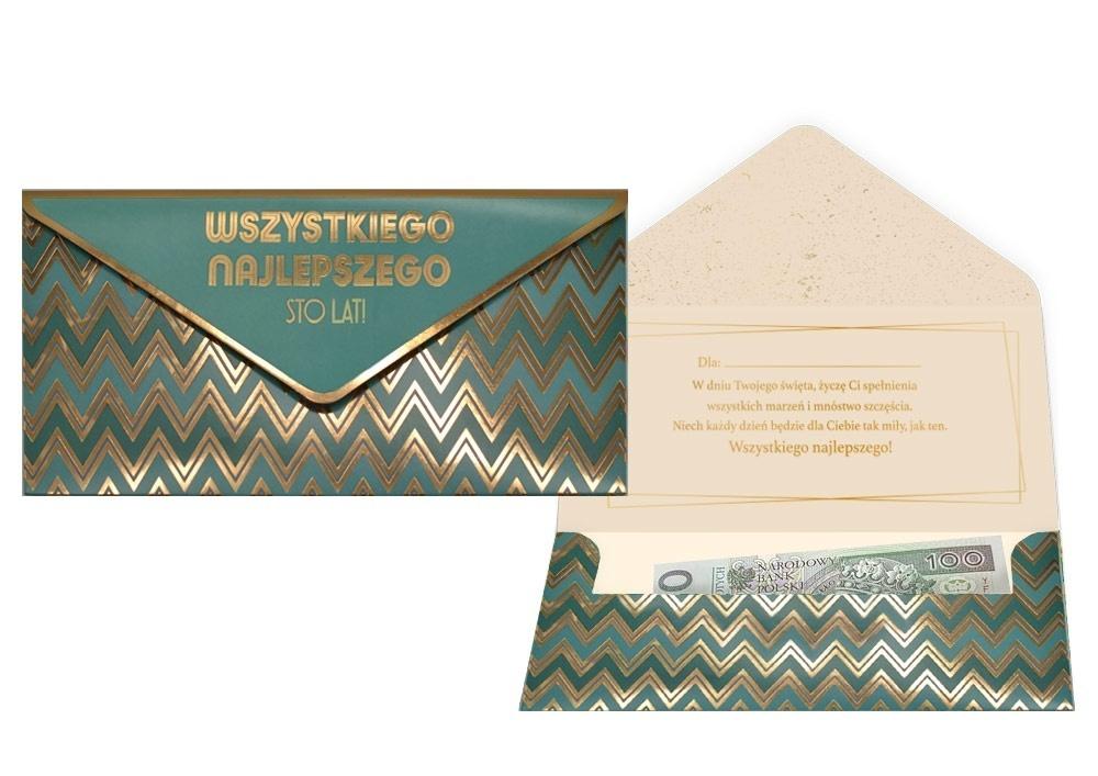 Koperta podarunkowa KOP-016 "Wszystkiego najlepszego, sto lat" Koperta podarunkowa jest eleganckim sposobem na podarowanie bliskiej osobie banknotu lub karty podarunkowej. Koperta jest kolorowa i uszlachetniona metalizowaną folią hot-stamp, jest solidnie wykonana i wyposażona w rzep, co umożliwia jej wielokrotne otwieranie i zamykanie. Koperta zawiera życzenia w środku. Specyfikacja: wymiary: 20 x 10,5 cm (po złożeniu) wnętrze: życzenia w środku okazja: ogólne życzenia, urodziny Koperty są pakowane po 3 szt.