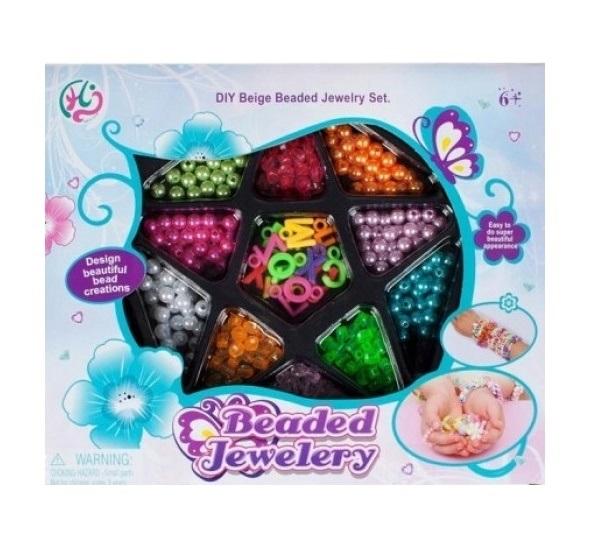 W zestawie znajdują się różnego rodzaju koraliki - w różnych rozmiarach, kolorach, kształtach i fakturach, tasiemki, żyłki. Produkt wykonany z plastiku.