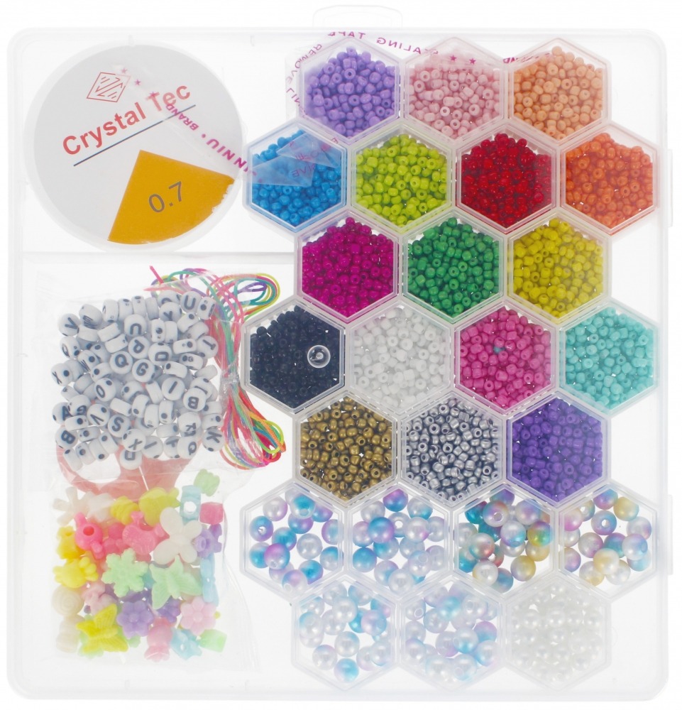 W zestawie znajdują się różnego rodzaju koraliki - w różnych rozmiarach, kolorach , kształtach i fakturach.