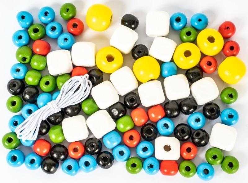 Koraliki drewniane w różnych kolorach, rozmiar koralików 10 - 15 mm, w opakowaniu 100 szt. + gumka biała 1 m