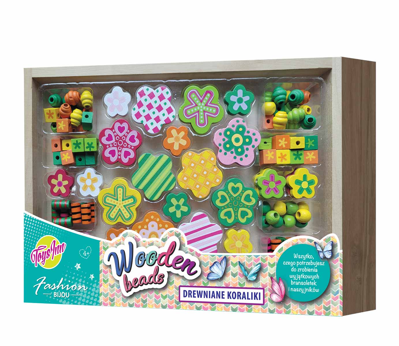 W zestawie znajduje się około 100 sztuk drewnianych koralików o różnych kształtach i wielkości, 10 drewnianych dużych kwiatów, 14 drewnianych małych kwiatów, około 6 m gumki.