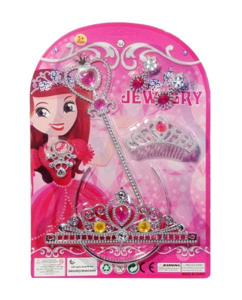 Zestaw dla małej księżniczki, tiara + biżuteria będzie stanowić idealne uzupełnienie stroju. W zestawie znajduje się tiara na opasce wraz z kolczykami, spinką i różdżką. Produkt zapakowany w kartonowe opakowanie z okienkiem. Zestaw przeznaczony dla dzieci od 3 lat. Podane wymiary stanowią wymiar opakowania.