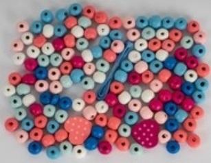 koraliki drewniane w różnych kształtach i kolorach, w zestawie sznurek