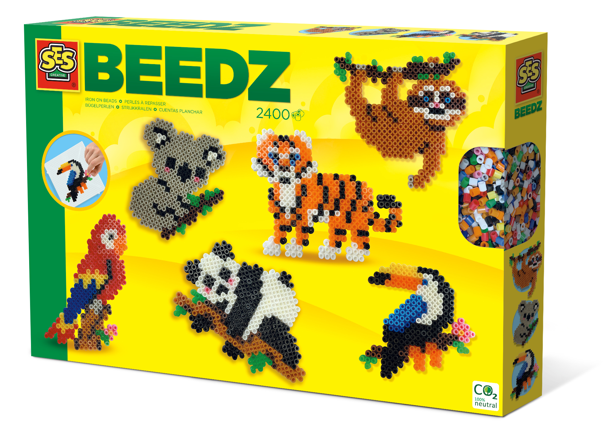 Stwórz najfajniejsze zwierzęta z dżungli za pomocą zestawu SES Beedz! Zrób wesołego tukana, śpiącego leniwca, kolorową papugę, zadziornego tygrysa, słodką koale i pande. Zestaw zawiera 2400 koralików i jasne instrukcje, więc to dziecinnie proste!