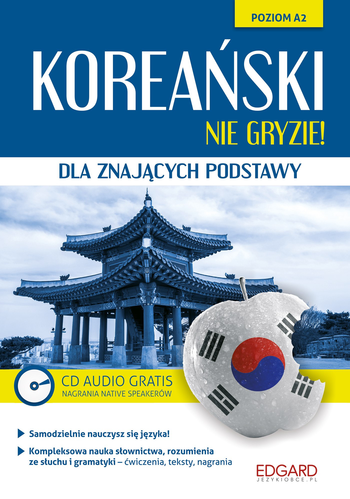 Koreański nie gryzie! dla znających podstawy to unikalny kurs do samodzielnej, aktywnej nauki języka koreańskiego przeznaczony dla osób, które opanowały podstawy języka koreańskiego i chcą kontynuować naukę na poziomie podstawowym wyższym (A2). Książka opiera się na unikalnej metodzie aktywnej nauki, która dzięki licznym ćwiczeniom trenuje wszystkie kompetencje językowe: rozumienie tekstu czytanego, rozumienie ze słuchu, tworzenie wypowiedzi ustnych i pisemnych. W 14 rozdziałach znajdziesz ciekawe teksty, przystępnie wyjaśnioną gramatykę, dialogi, porcję słówek, liczne ćwiczenia leksykalne i gramatyczne, a także ciekawostki o kulturze koreańskiej. Na końcu każdego rozdziału umieszczono praktyczny słowniczek. Dołączona do kursu płyta CD Audio zawiera nagrania w wykonaniu profesjonalnych lektorów. Słuchanie nagrań ułatwia naukę płynnego porozumiewania się w języku koreańskim. Nowość! Unikalna metoda aktywnej nauki: - poznajesz niezbędne słownictwo - ćwiczysz zastosowanie gramatyki - rozwiązujesz różnorodne ćwiczenia - doskonalisz rozumienie ze słuchu - uczysz się konstruować wypowiedzi pisemne