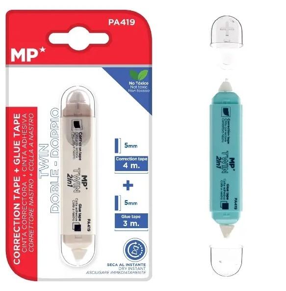 Sucha taśma korekcyjna + podwójna taśma klejąca. Dwa w jednym: popraw i wklej! Obie taśmy mają szerokość 5 mm. Długość taśmy korekcyjnej wynosi 4m,a taśmy klejącej 3m. Obie taśmy posiadają osłonę ochronną, dzięki czemu nie ulegają uszkodzeniu.Nietoksyczne. Świetna siła krycia i przyczepność.Przesuwają się po papierze bez zacinania się. Blister 1 sztuki.
