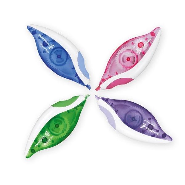 Opakowanie 12 korektorów w taśmie zawiera: 3 zielone, 3 niebieskie, 3 różowe i 3 fioletowe korektory.