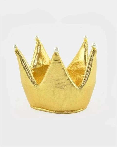 Złota korona dla małej księżniczki. Doskonały gadżet na bal karnawałowy, zabawy z przyjaciółmi. Starannie zadbano o detale : materiał satyna w kolorze złotym, białe perełki oraz miękka piankowa gumka.