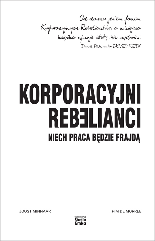 Od dawna jestem fanem Korporacyjnych Rebeliantów, a niniejsza książka ujmuje istotę ich mądrości. Autorzy prezentują rzeczową, praktyczną i dającą do myślenia perspektywę patrzenia na świat pracy. Daniel Pink, autor książek Kiedy i Drive. Kompletnie nowe spojrzenie na motywację Rzucaj wyzwanie przyjętym prawdom – to moje powracające motto i to jest właśnie to, co robią Korporacyjni Rebelianci! Mądra lektura dla wszystkich pracowników, specjalistów działów kadr i przywódców biznesów, którzy chcą tworzyć radykalnie inspirujące miejsca pracy. Katarina Berg, dyrektor ds. personalnych w Spotify Toczy się cicha rewolucja zarządzania. Aby ludzie zauważyli rewolucję i przyłączyli się do niej, musimy udzielać jej głosu, a raczej wielu, wielu głosów. Korporacyjni Rebelianci postawili sobie za zadanie przekazywanie nam takich głosów oraz związanych z nimi historii. Frederic Laloux, autor książki Pracować inaczej Joost i Pim, znani jako Korporacyjni Rebelianci, realizują swą misję sprawiania, by praca była frajdą. Porzucili frustrujące zajęcia w korporacjach, aby odwiedzić najbardziej inspirujące firmy świata. Prezentując kolejne miejsca i ludzi, których już spotkali, dzielą się z czytelnikami tym, czego się do tej pory nauczyli i dowiedzieli. Oto książka dla ludzi, którzy wiedzą, że miejsca pracy mogłyby i powinny być lepsze. Niezależnie od tego, czy wchodzisz w skład zespołu zarządzającego, czy jesteś rebeliantem zdławionym przez korporacyjne dogmaty czy też menadżerem, który utknął w niesprawnym systemie, ta książka z pewnością jest dla ciebie! Blog Korporacyjnych Rebeliantów czytany jest w ponad 100 krajach. Ich blogowe wpisy były wykorzystywane przez takie media, jak „The New York Times”, „Forbes”, „HuffPost”, „The Guardian” czy BBC. Obaj autorzy znaleźli się na liście Top 30 Emergent Management Thinkers (Najlepszych 30 Myślicieli Wyłaniającego się Nowego Zarządzania) i zdobyli w 2019 roku nagrodę Thinkers50 Radar Award.