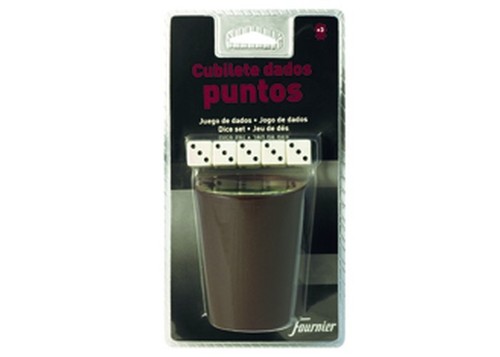 Kości do gry FOURNIER POKER 5 sztuk + kubek do kości Zestaw zawiera 5 kostek pokerowych do gry 15 mm. oraz kubek z tworzywa sztucznego wyściełany zielonym suknem. Wysokość kubka 85 mm, średnica górna 65 mm.