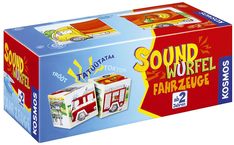 Kostki dźwiękowe, które wprowadzą nas w świat pojazdów i dźwięków, które wydają. Prawidłowe dopasowanie kostek włącza dźwięk, odpowiadający obrazkowi. Kostki dźwiękowe wspierają rozwój umiejętności kojarzenia i małą motorykę dziecka, a przede wszystkim dają dużo zabawy. Automatyczne sygnalizacja prawidłowego dopasowania umożliwia samodzielną zabawę. Pudełko w języku niemieckim, w środku znajduje się kolorowa instrukcja w języku polskim oraz niemieckim.