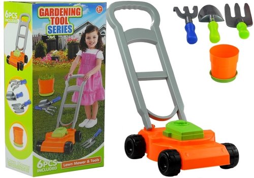 Zestaw Kosiarka + Akcesoria Ogrodnicze Idealny prezent dla małego ogrodnika Każdy maluch uwielbia pomagać swoim rodzicom w wiosennych porządkach w ogrodzie. Tym razem będzie mógł pracować swoim własnym zestawem małego ogrodnika. Zestaw Zawiera: - kosiarka - doniczka - podstawka - grabki - łopatka - widełki Wymiary Kosiarki: - wysokość od ziemi do rączki od 63 cm - wymiary panelu kosiarki 22 x 31 x 10 cm Doniczka:wysokość: 12cm / średnica 12cm