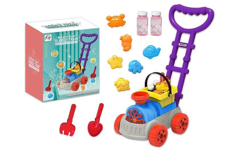 W zestawie: kosiarka/lokomotywa z wiatraczkiem do robienia baniek, 2 butelki z płynem do robienia baniek mydlanych, wiaderko 12,5 x 9 x 12,5 cm., sitko, łopatka, grabki, 6 kolorowych foremek w kształcie morskich zwierzątek, Funkcje: terkoczące kółka, przycisk na rączce uruchamia: wiatraczek, który wytwarza równocześnie dużą liczbę baniek, wesołe melodie, odgłos puszczanych bąbelków, odgłos jadącej lokomotywy. Pozostałe informacje: wym. kosiarki: 24 x 49 x 26,5 cm., wym. opakowania: 24 x 29,5 x 20 cm., baterie: 4 x AA 1,5V brak w zestawie, 3+