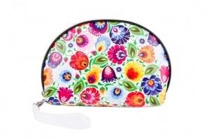 Łowicką kosmetyczkę zdobią barwne kwiaty z łowickiej wycinanki na czarnym tle. Wzór ten inspirowany jest tradycyjnym wzorem ludowym z regionu łowickiego. Elementem przewodnim na łowickich wycinankach są koguty, pawie oraz motywy kwiatowe