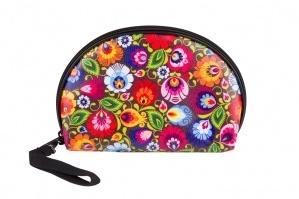 Łowicką kosmetyczkę zdobią barwne kwiaty z łowickiej wycinanki na czarnym tle. Wzór ten inspirowany jest tradycyjnym wzorem ludowym z regionu łowickiego. Elementem przewodnim na łowickich wycinankach są koguty, pawie oraz motywy kwiatowe.