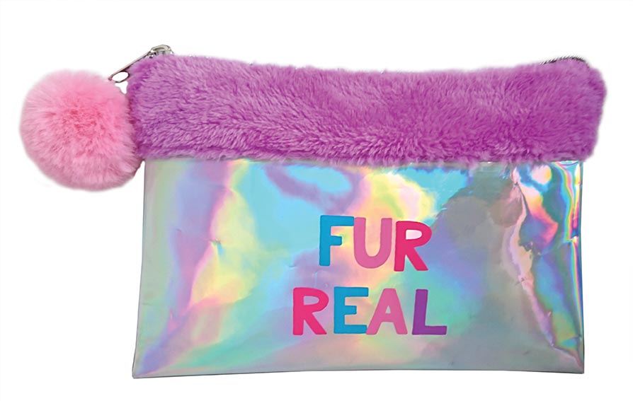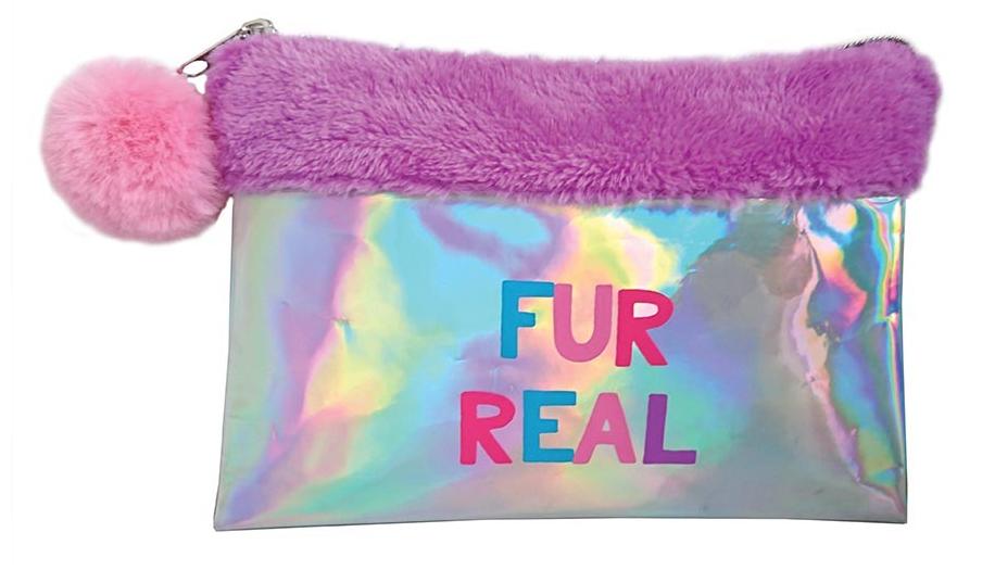 Kosmetyczka wykonana jest z metalicznego materiału wykończonego króciutkim, jasno różowym futerkiem. Na środku kosmetyczki znajduje się napis „FUR REAL”. Kosmetyczka posiada jedną komorę zamykaną na zamek błyskawiczny, na końcu którego dynda jasno różowy futerkowy pompon. Metaliczny materiał zabezpiecza przedmioty w środku przed zalaniem.