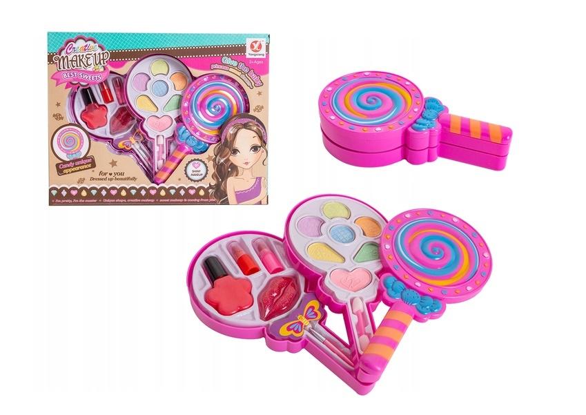 Zestaw składa się z 11 kosmetyków dla lalek, dzięki którym dziewczynki wykonają liczne wersje makijażu. W komplecie znajduje się 7 kolorowych cieni do powiek, 2 pomadki, czerwony lakier do paznokci, 2 aplikatory i błyszczyk umieszczony w pojemniczku w kształcie ust. Kosmetyki znajdują się w różowym, wysuwanym opakowaniu w kształcie lizaka, który zachwyci wszystkie dziewczynki. Estetyczne opakowanie, barwne kolory i wysoka jakość wykonania sprawia, że zestaw kosmetyków dla lalek jest idealnym prezentem dla małych wielbicielek make-upu.