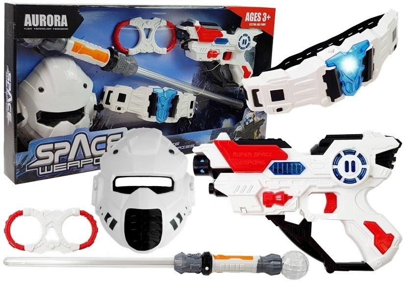 Zestaw broni kosmicznej z mieczem + maska Przedstawiamy niesamowity zestaw kosmicznej broni, który jest idealnym rekwizytem do stoczenia walki z groźnym wrogiem z odległej planety. Ta niespotykana, oryginalna broń posiada kosmiczne dźwięki i światła, co z pewnością zachęci do zabawy wszystkie dzieciaki. W skład zestawu kosmicznej broni wchodzą: -maska, pas - pistolet, - miecz świetlny, -kajdanki Kosmiczny środek bojowy składa się z pistoletu, miecza oraz dodatków. Kolorystyka tych środków obrony składa się z jasnych, stonowanych kolorów, połączonych z intensywną czerwienią oraz koralowym odcieniem. Maska dołączona do zestawu zaprojektowana jest w biało-czarnej kolorystyce, posiada prostokątny otwór na oczy, dziurki w okolicy ust oraz doczepioną z tyłu gumkę, która sprawi, że podczas zabawy maska będzie pozostawać na właściwym miejscu. Miecz świetlny działa po wciśnięciu guziczka znajdującego się w centralnej części uchwytu. Pistolet po wciśnięciu spustu również świeci się i wydaje dźwięki, dlatego warto wypróbować zabawkę w ciemnym pomieszczeniu. W zestawie znajdują się dodatki takie jak kajdanki, pas i maska. Plastikowy pas na gumie posiada efekty świetlne i dźwiękowe. Zabawka jest bateriami 3 x 1.5 V "AA", które nie są dołączone do zestawu. Wszelkie elementy kosmicznego kompletu wykonane są z wysokogatunkowego materiału, czyli plastiku. Zabawka posiada certyfikat CE, zapakowana jest w duże, kartonowe pudełko ozdobione kosmicznym motywem oraz zdjęciem robota - elementy te sprawiają, że jest doskonałym pomysłem na prezent dla chłopca. Wymiary elementów zestawu: - maska: 18 cm x 23 cm, - pistolet: 24 cm x 16 cm. Wymiary opakowania kosmicznej zabawki: - 64 cm x 33 cm x 7 cm