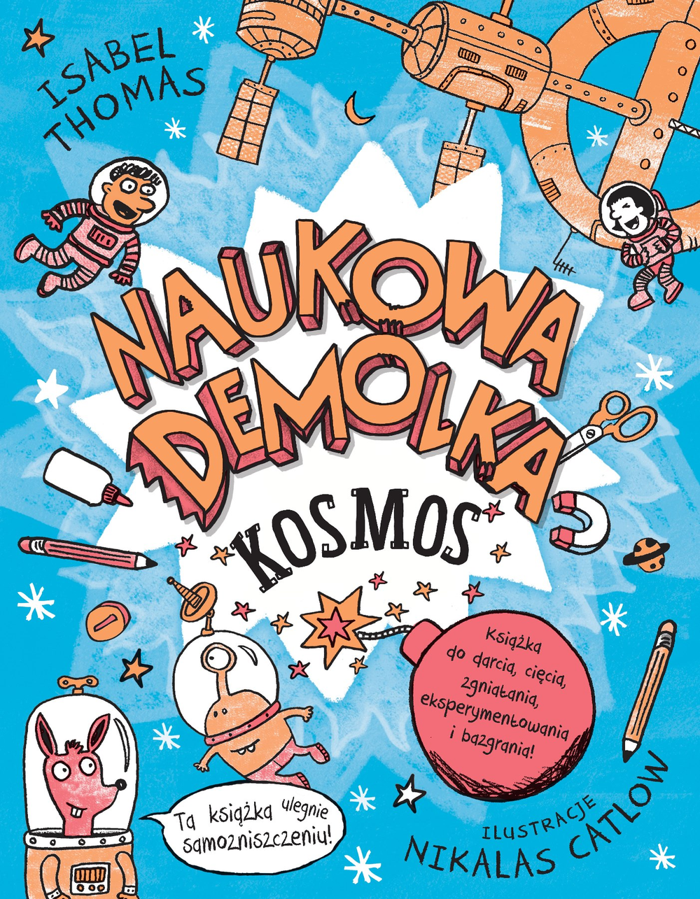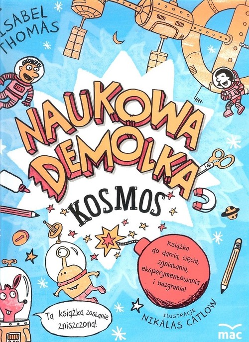 Kosmos, pierwszy tom serii „Naukowa demolka”, autorstwa Isabel Thomas to książka pełna zabawnych i ekscytujących projektów. Jej kartki można wykorzystać na różne sposoby. Publikację można składać, ciąć, mazać. Słowem, można z nią dowolnie eksperymentować, aby dowiedzieć się wszystkiego o kosmosie! Dzięki książce można zrobić prawie wszystko, począwszy od marsjańskiego robaka, a na kieszonkowej rakiecie skończywszy. Przystępne instrukcje i barwne ilustracje sprawiają, że nauka jeszcze nigdy nie była tak zabawna.